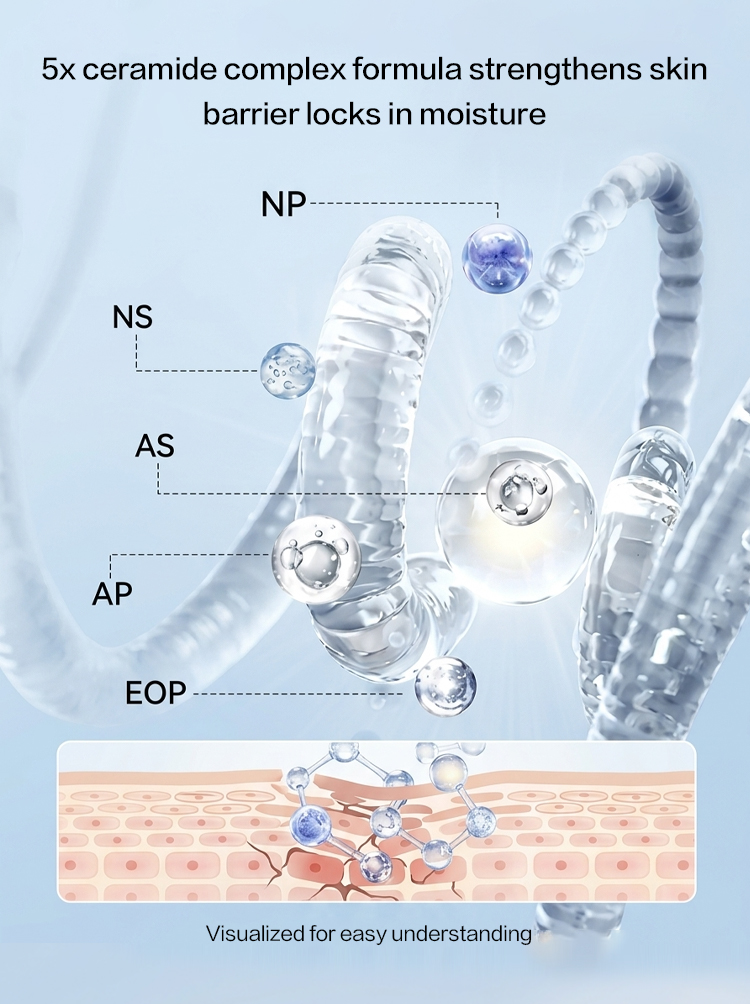 - Key ingredients: 5X Ceramides (NP, AS, NS, AP, EOP), 4D Hyaluronic Acid, Centella Asiatica extract, Panthenol (Vitamin B5)